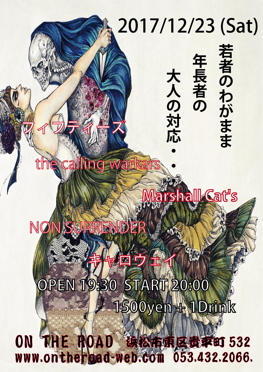 2017/12/23 (Sat) 1F Live 若者のわがまま 年長者の大人な対応 出演者(順不同) ・フィフティーズ ・the calling warkars ・Marshall Cat's ・NON SURRENDER ・キャロウェイ OPEN 19:30 START 20:00 1500yen + 1Drink