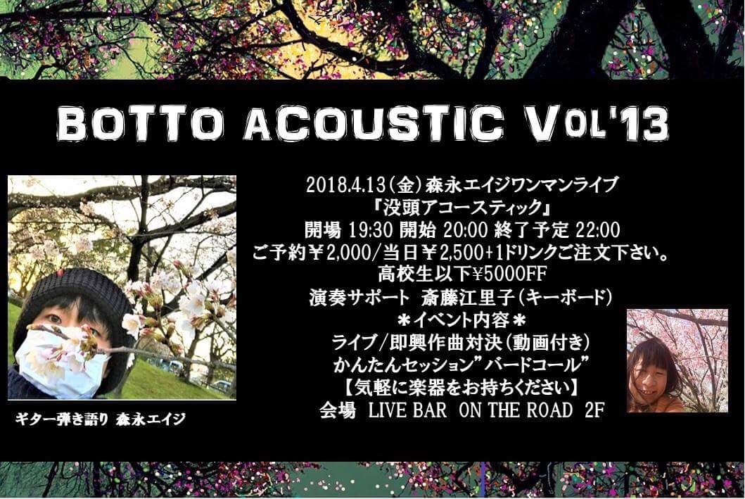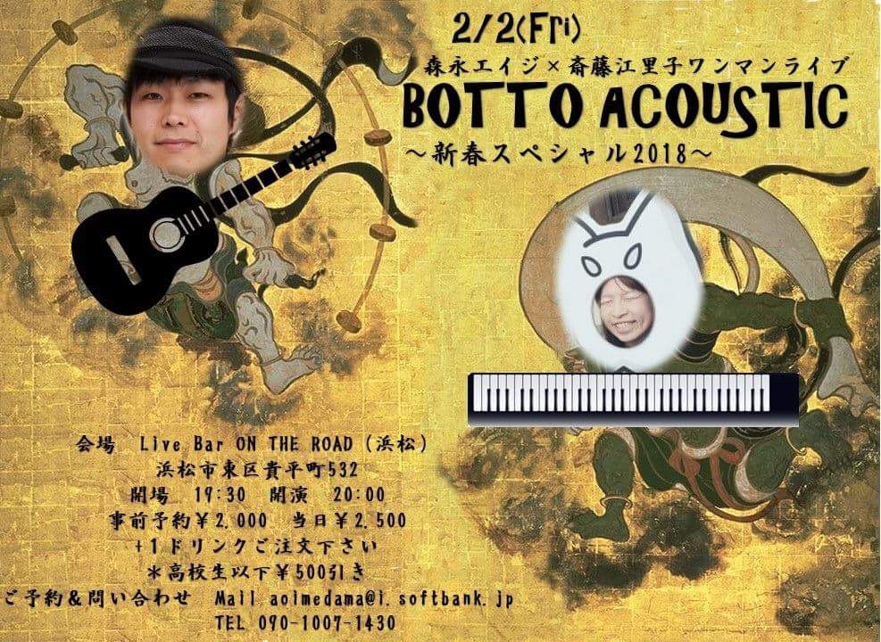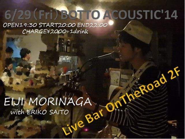 2018/05/29 (Fri) 森永エイジ BOTTO ACOUSTIC BOTTO ACOUSTIC Vol.14 EIJI MORINAGA with ERIKO SAITO OPEN 19:30 START 20:00ご予約 前売り 2000円+1ドリンク 当 日 2500円+1ドリンク 高校生以下 500円オフ