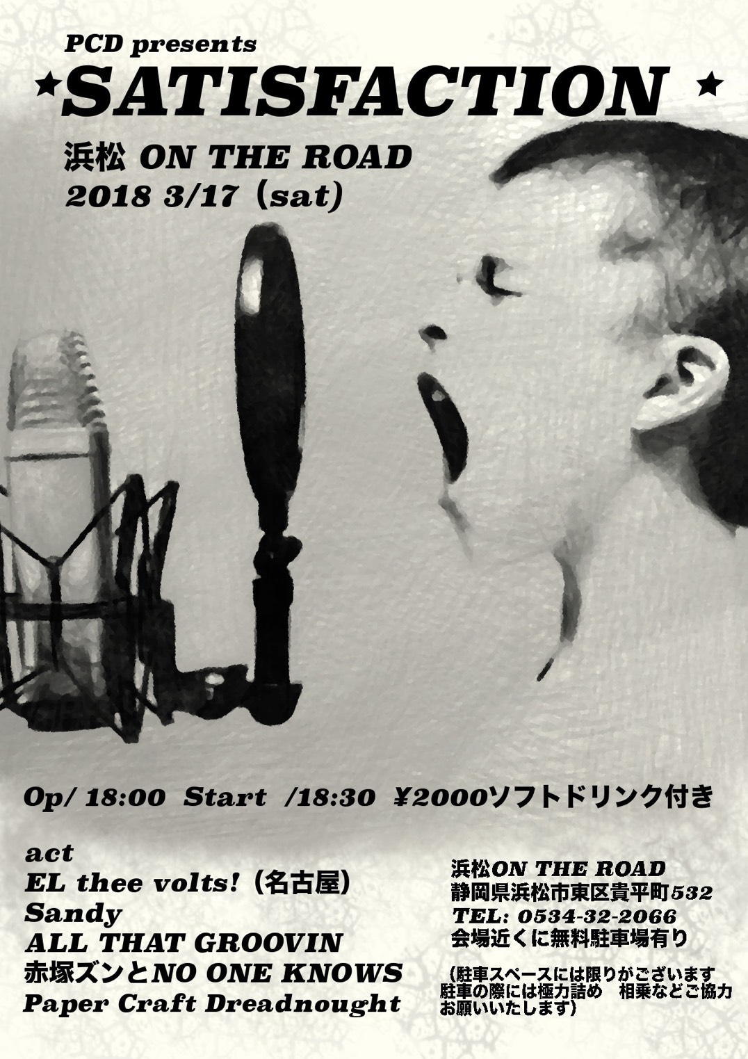 2018/03/17 (Sat) 1F Live ★SATISFACTION★ OPEN 18:00 START 18:30 LIVE CHRAGE 2000yen(1SoftDrink付き) act ・EL thee volts!(名古屋) ・Sandy ・ALL THAT GROOVIN ・赤塚ズンと NO ONE KNOWS ・Paper Craft Dreadnought ※車にてお越しの際には 駐車スペースの関係上極力相乗りにてお願い致します ※駐車の際には 奥から順に詰めて駐車する様 お願い致します