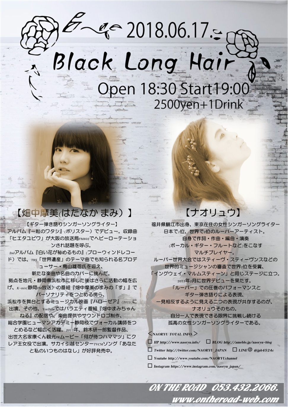 2017/05/17 (Sun) Black Long Hair 畑中摩美&ナオリュウLive Black Long Hair Open 18:30 Start 19:00 2500yen + 1Drink