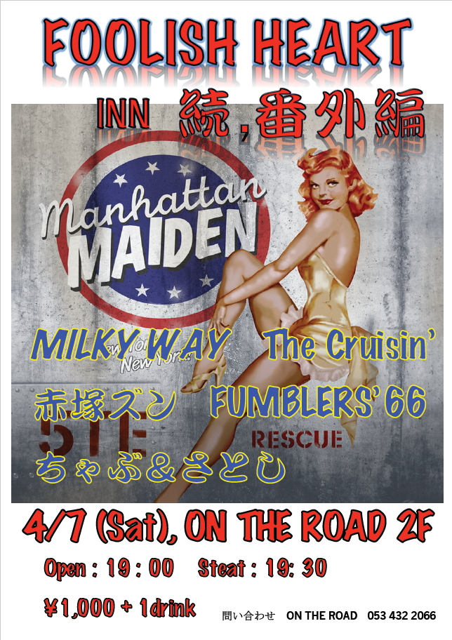 2018/04/07 (Sat) FOOLISH HEART 続.番外編 2017年12月に行われた 「FOOLISH HEART 年末番外編」に引き続き 二発目を行います! 続.番外編!! MILKY WAY The Cruisin' 赤塚ズン FUMBLERS'66 ちゃぶ & さとし OPEN 19:00 START 19:30 Charge 1000yen + 1Drink