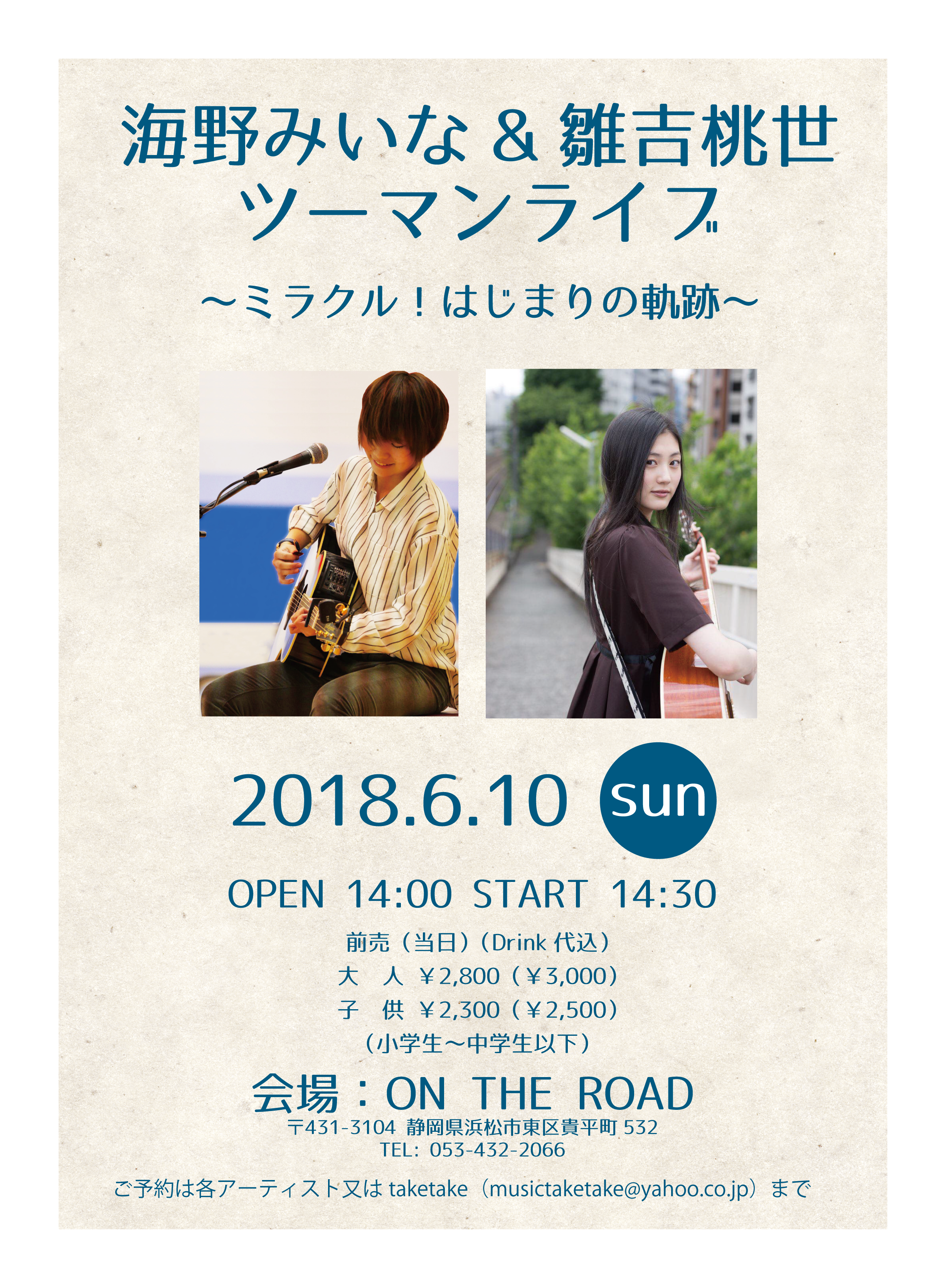 2017/05/10(Sun) 海野みいな & 雛吉桃世 ツーマンライブ たけたけさん企画 海野みいな & 雛吉桃世 ツーマンライブ ~ミラクル!はじまりの軌跡~ OPEN 14:00 START 14:30 LiveCharge 大人 2700 yen 当日 3000yen 子供 2300yen 当日 2500yen